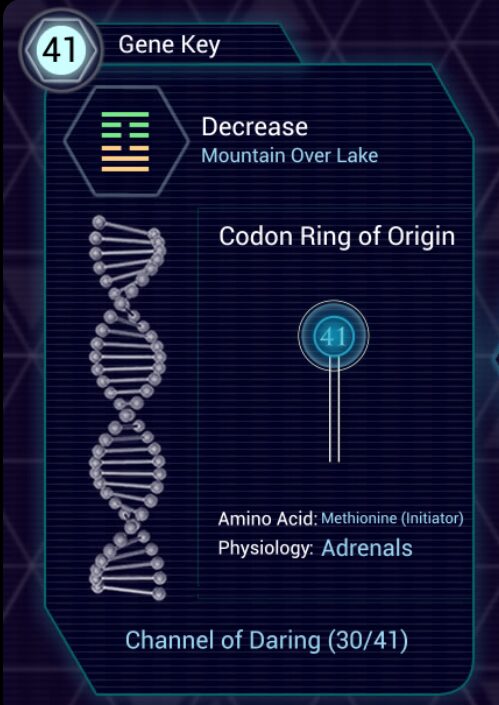 في علم الأحياء ، يُعد الكودون البادئ initiating codon الإشارة الوحيدة التي تسمح للريبوسوم Ribosome ببدء ترجمة الشيفرة الوراثية إلى بروتين حيّ، وبدونه تبقى كل الإمكانات الوراثية كامنة بلا تجسّد؛ وبالمثل في هيومان ديزاين تمثّل بوابة 41 ضغط الجذر الذي يمنح الجسد الإذن الطاقي للدخول في تجربة جديدة، لتتحوّل الرغبة الكامنة إلى مسار حياتي فعلي.