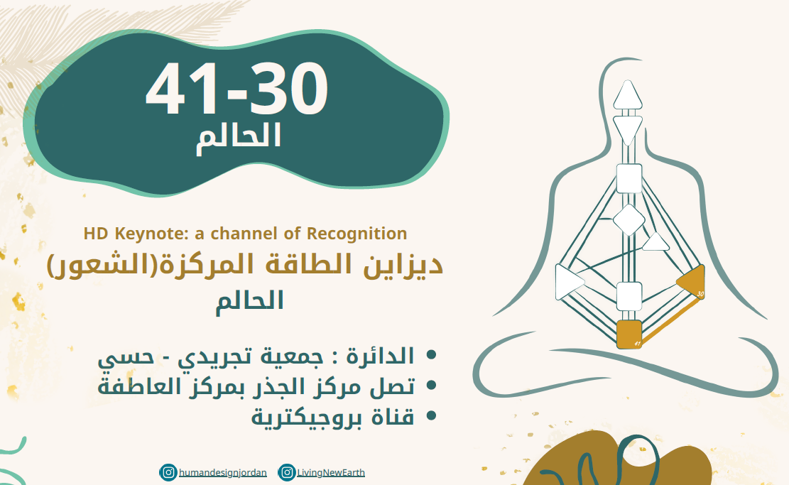 بوابة 41 موجودة في مركز الجذر، وهو مركز ضغط طاقي (Motor) يعمل على خلق توتّر داخلي يدفع باتجاه الاختبار والتجربة. هذه الطاقة تتوجّه نحو مركز العاطفة عبر بوابة 30، بوابة الشغف والرغبات، مُشكِّلة قناة 41–30؛ قناة الطاقة المركّزة نحو الحلم المشترك، وهي جزء من مسار المفاجآت.